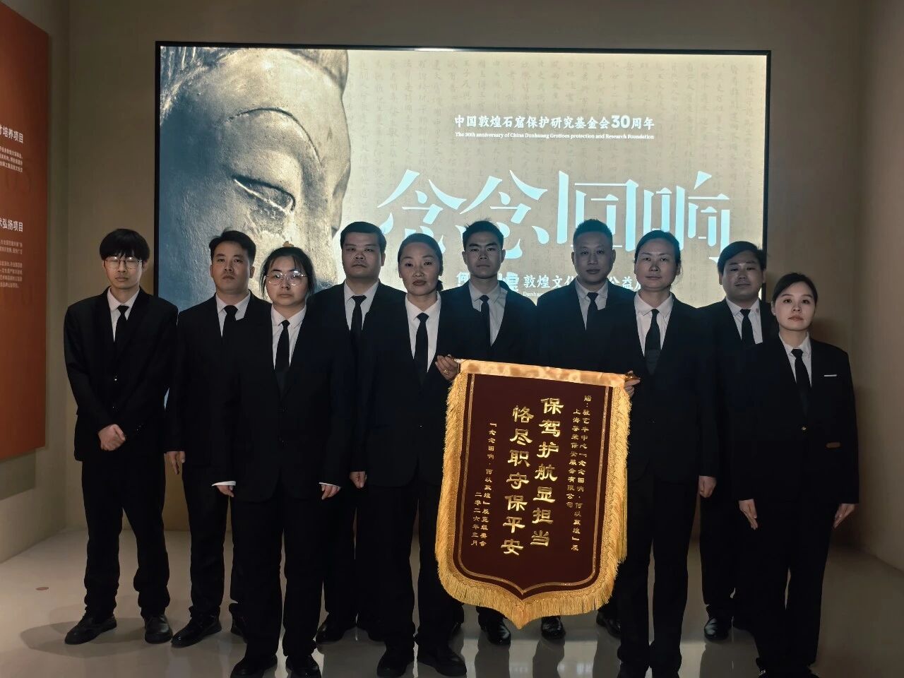 2026年3月春风再度唤醒黄浦江时,这场持续约6个月的“念念回响·何以敦煌”艺术展以更宏大的叙事在上海艺丰中心画上圆满句点。敦煌展览组委会将绣着“恪尽职守保平安,保驾护航显担当”的锦旗郑重交予尊荣团队。这面跨越两年的锦旗,见证着从中华艺术宫到艺丰中心的文明守护接力。